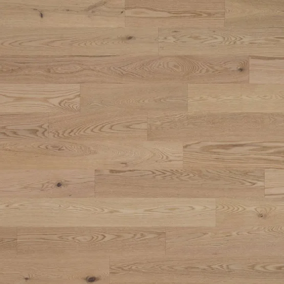 Red Oak hardwood in Aspen finish with a brushed texture and ultra-matte sheen. Character-grade planks feature natural color variation and knots, available in solid or engineered construction.