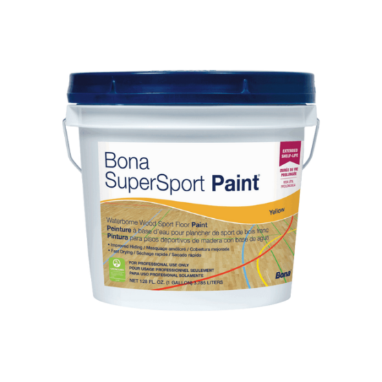 BONA SuperSport Paint® Yellow is a fast-drying, water-based game line paint manufactured for use with both Bona® waterborne and oil-modified sport floor sealers and finishes. It provides vibrant Yellow lines with excellent coverage and durability, ideal for professional maple sport floors in gyms, arenas, and multi-use courts.